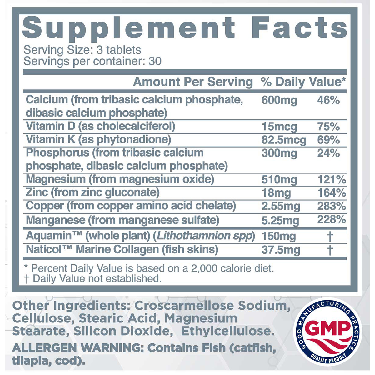 Together, this team doesn’t just dump calcium into your body; it ensures that calcium is delivered, absorbed, and properly utilized to fortify your skeleton. We’ve enhanced this already powerful matrix with Naticol™ Marine Collagen for additional connective tissue support and Aquamin™ , a mineral-rich red algae, for a full spectrum of bone-supporting trace minerals.