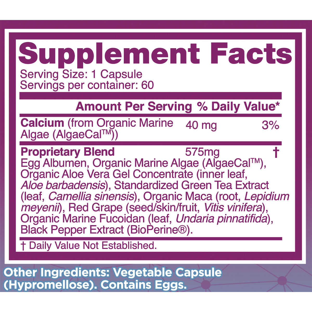 Organic Marine Algae (AlgaeCal™), Organic Fucoidan Algae & Red Grapes: The foundational supporters. This trio delivers concentrated minerals, antioxidants, and polyphenols to support bone density, heart health, and immune function—the pillars of overall wellness.