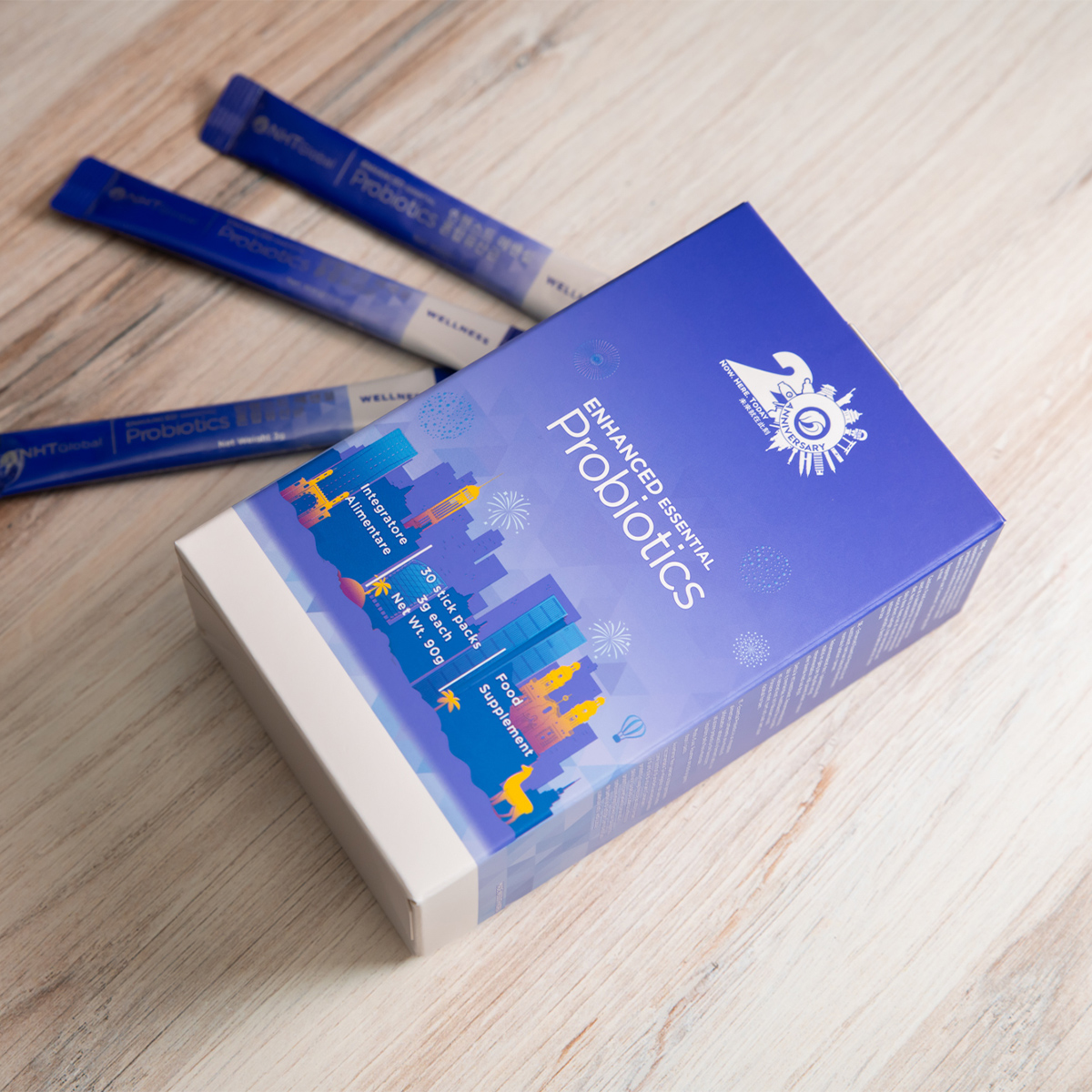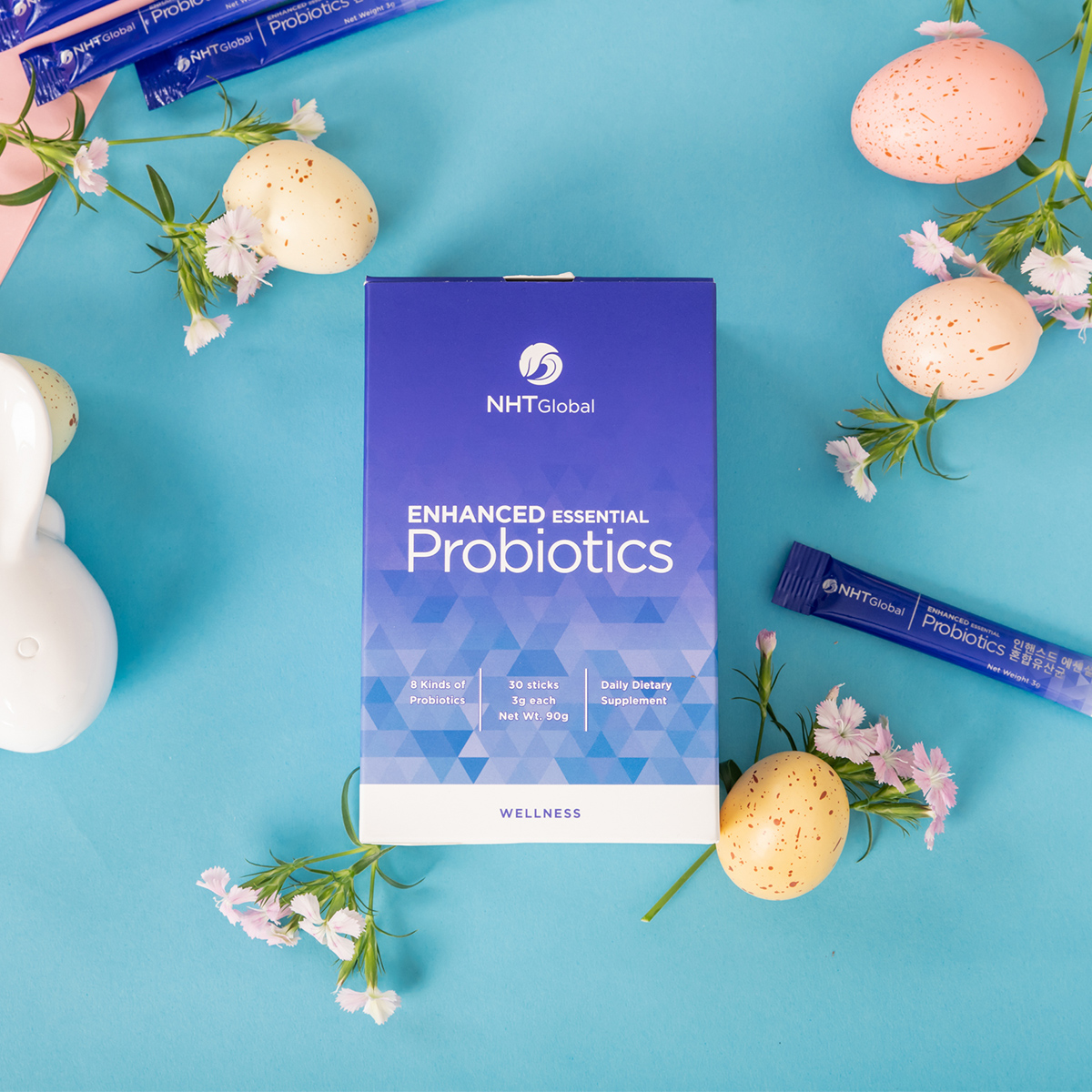 NHT Global Enhanced Essential Probiotics uses quadruple-coated 8-strain technology with over 10 billion CFUs to balance gut flora, ease digestion, and boost immunity.